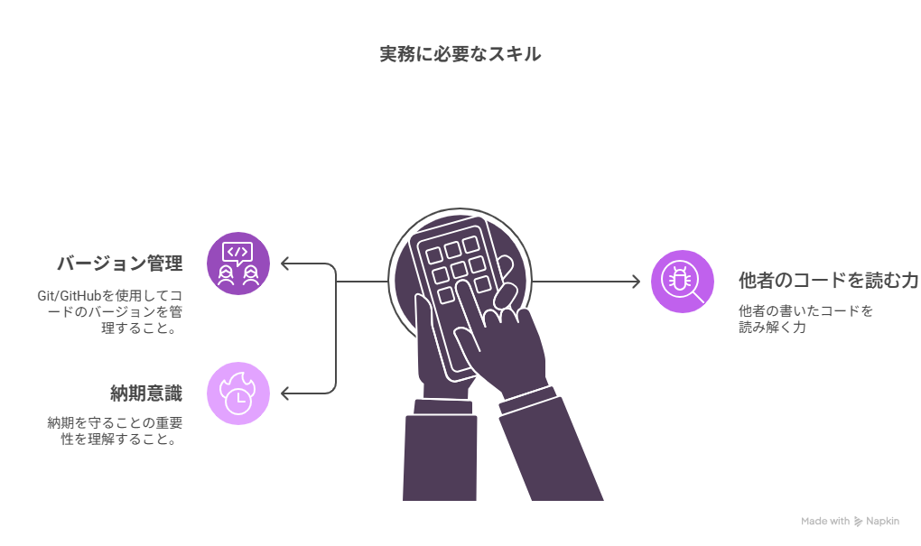 未経験からエンジニアを目指すなら、学習内容を「現場で必要なスキル」に寄せていくことが重要です。 スクールや独学だけではカバーしきれない、実務で求められる力を意識して勉強しましょう。 具体的には以下のポイントを押さえておくべきです。